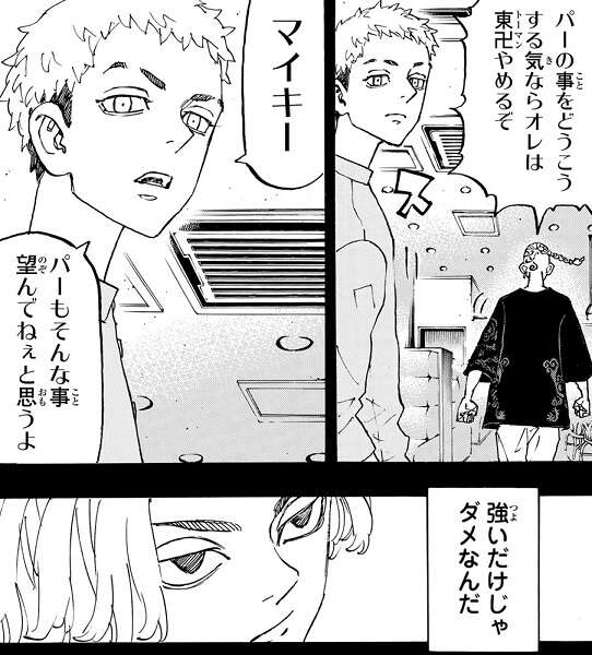 ドラケンと出会ったマイキーは、さらに場地、三ツ谷、パーちん、一虎を誘い、東京卍會を結成します。しかし、その後兄の真一郎が一虎に殺されたことを機に、“強い”だけじゃ駄目だと思うようになり、東卍を日本一デカいチームにしたいと思うようになります。マイキーは東卍を大きくすることで、真一郎を失った心の穴を埋めようとします。