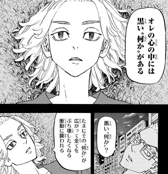 マイキーは稀咲に、自分の中に黒い“何か”がある事や、たまに“何か”が広がって全てをぶち壊したくなる衝動に襲われる事を打ち明けます。そしてマイキーは、オレのそんな部分と付き合って欲しい、オレを導いてくれ、と稀咲に頼みますが、黒い“何か”に身を任せようとしたマイキーを止めたのは武道でした。