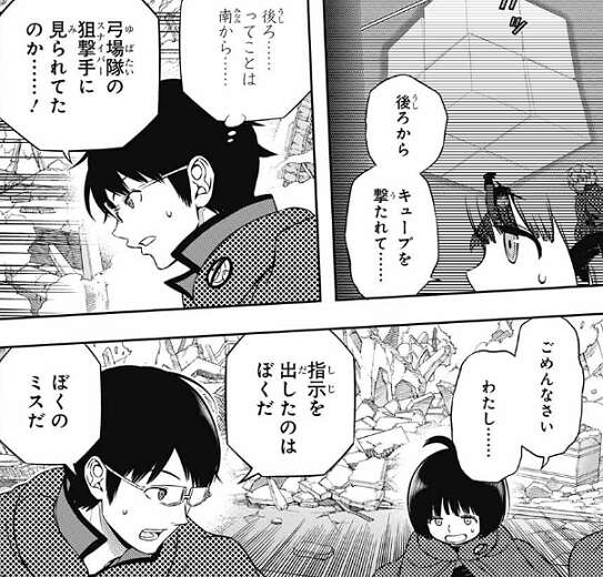 炸裂弾(メテオラ)が暴発してしまった事に責任を感じる雨取ですが、三雲は二人とも無傷で済んだのは雨取のおかげだと雨取をフォローします。一方、玉狛第2を追って、再び狙撃をしようとする外岡です。