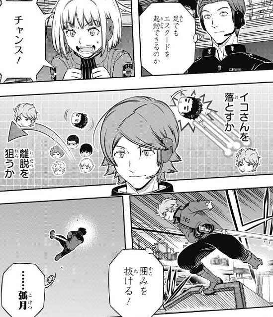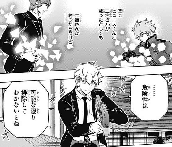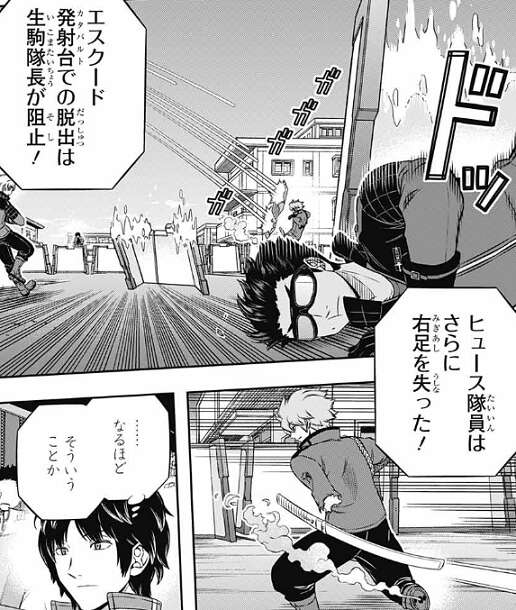 ヒュースの「隠し玉」バイパーは二宮用で、二宮を倒すつもりだったと見抜いた犬飼はリスクを可能な限り排除しようと、ヒュースを狙います。一方、両足を失ったヒュースにトリオン漏出甚大の警告が出ます。