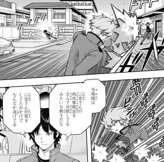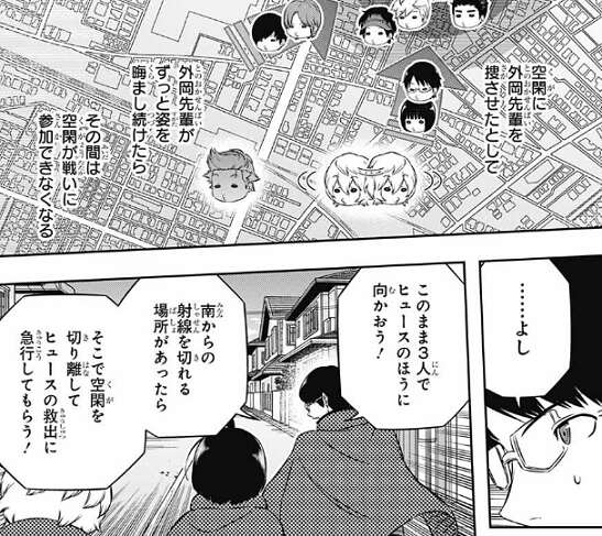 三雲は外岡を倒せないか空閑に聞きますが、今は居場所が分からず空閑でも厳しいようです。三雲は外岡がこのまま姿を晦まし続けたら、その間空閑が戦いに参加できなくなると判断し、ヒュースと合流する事を優先します。