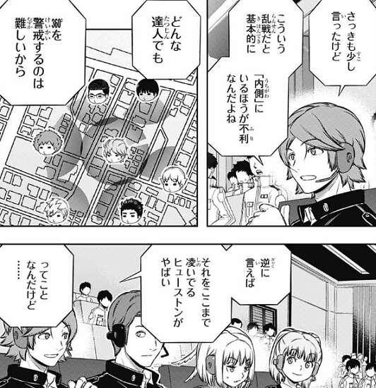 二宮隊に注意しつつ合流を急ぐ三雲達、一方で片足を失ったうえ生駒隊と弓場隊、犬飼に囲まれたヒュースは、守りにトリオンを集中しなくてはならず反撃する隙がなく厳しい状況です。