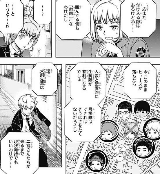 小南は囲んでいる側も敵同士で、生駒隊、弓場隊、犬飼の考えもバラバラのだから、まだ付け入るスキはあるはずと言います。しかし、王子はそれでヒュースを取り逃がすほどB級上位は甘くないと、小南の考えを否定します。