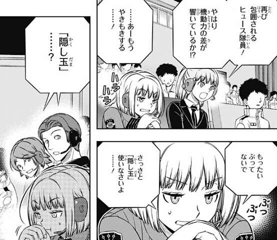解説席でやきもきする小南はつい、ヒュースの「隠し玉」変化弾(バイパー)の事を口走ってしまい、まわりから突っ込まれてしまいます。何とかごまかす小南ですが、実際に戦っている犬飼も「隠し玉」について何となく気付いているようです。178話で小南と犬飼との会話の中で、ヒュースのトリオンの大きさの割に通常弾(アステロイド)の威力が低い気がすると話していたので、この時から弾の仕掛けに何かないか考えていたようです。