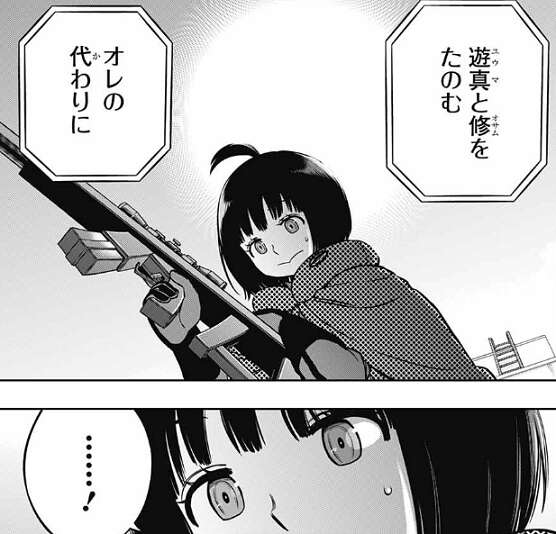 そこにヒュースから雨取に通信が入り、訓練通り撃たせてやれなくて悪い、オレは死んだとヒュースに言われます。実際の戦場では空閑や三雲が死ぬ場合もあるとヒュースに言われた事を思い出し、更に思いつめてしまいます。しかし、ヒュースから空閑と三雲を自分の代わりに頼むと言われ、雨取の表情が変わります。