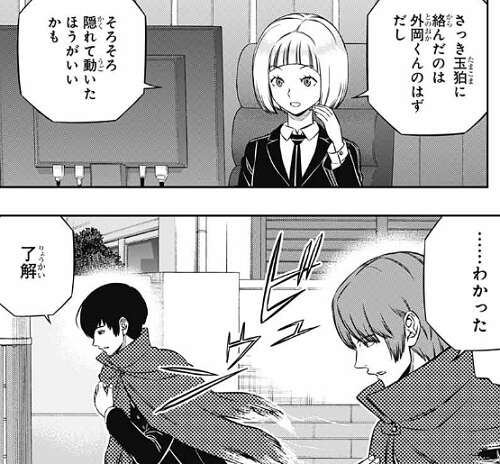 二宮隊の二宮と辻は玉狛第2の三人と外岡を警戒して、バッグワームを着けて隠れて行動し始めます。一方、二宮と辻がレーダーから消えたことで、のんびりしていられないと生駒隊は始めヒュースの包囲の陣が、徐々に狭まっていきます。