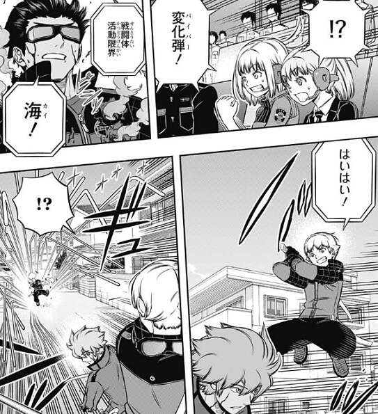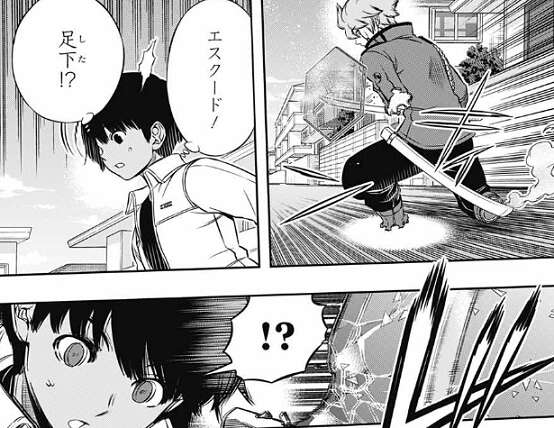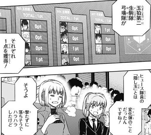 弓場隊はヒュースを動かして生駒隊を狙わせ、隙を作ろうとしますが、ヒュースはエスクードを起動し車を動かし、弓場と帯島に当てます。いきなり別角度から車をぶつけられ、弓場隊は連携を崩されます。
