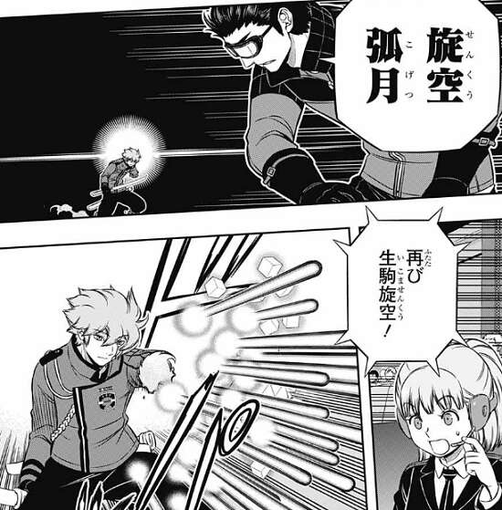弓場隊の連携は崩れますが、犬飼がヒュースへのプレッシャーを強めて、ヒュースの包囲の陣を崩そうとしません。そこに生駒が再び生駒旋空で攻撃しようとします。