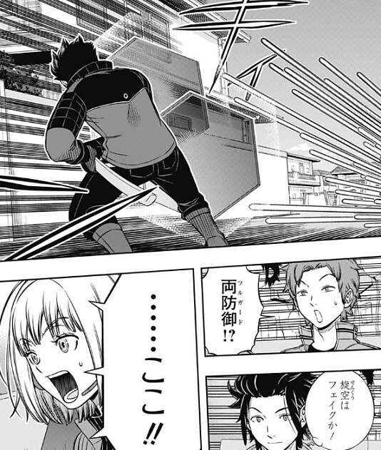 ヒュースは生駒旋空を防ごうと、アステロイドで攻撃しますが生駒旋空はフェイクで、生駒は両防御(フルガード)を行います。