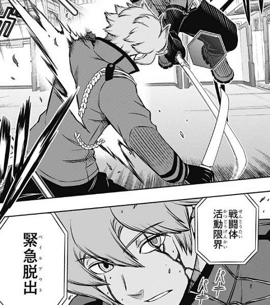 生駒の戦闘体が活動限界を迎えますが、すぐに南沢に指示を出しヒュースを攻撃させます。しかし、ヒュースの放ったバイパーは南沢の攻撃も想定していて、南沢の所に戻ってくる弾道が設定されてます。南沢にもバイパーが当たったかと思われましたが、水上がヒュースのバイパーをガードし、攻撃を防ぎます。