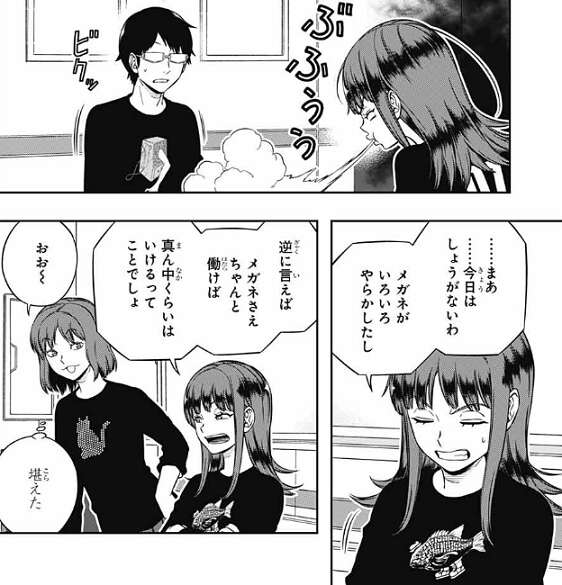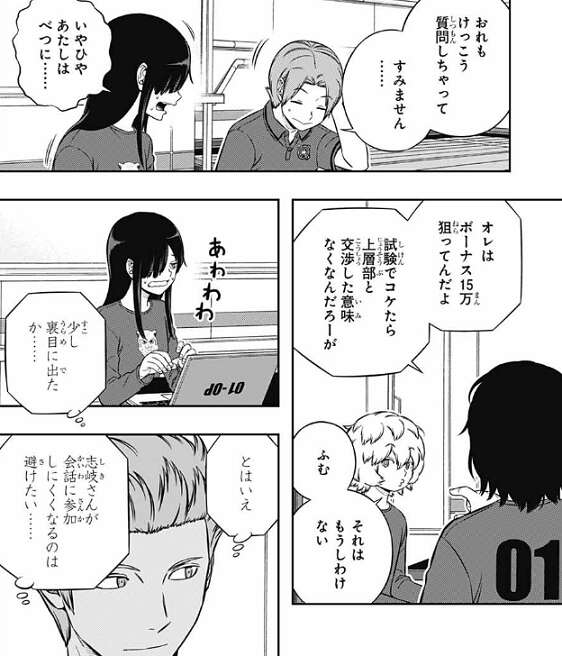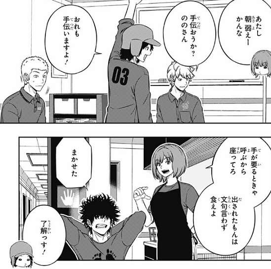 柿崎3番隊も夕食の準備に取り掛かっていて、弓場隊のオペレーター・藤丸が夕食を作ろうとしています。犬飼と別役は手伝いを買って出ますが、影浦はまかせたと言い、何もしようとしません。