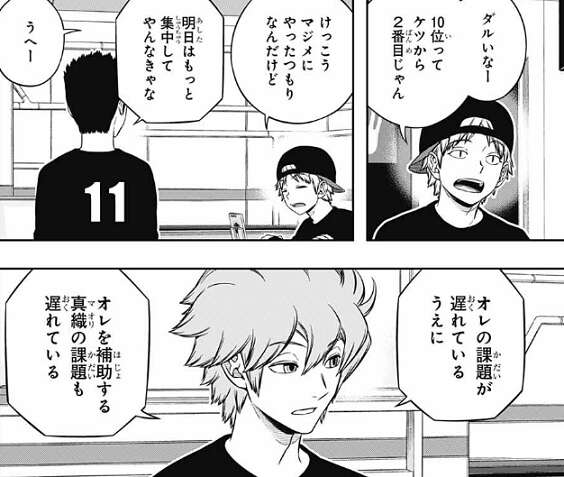 さらにヒュースは、三雲のチームの点数が低いのは三雲かオペレーターのトリオンが切れて、途中から課題が出来なかったあたりの理由だろう、と分析します。それを聞いて半崎が、実質うちが最下位ってこと?と、言い若村は落ち込みますが、ヒュースは『共通課題』の遅れを取り戻す方法なら、一つあると言います。