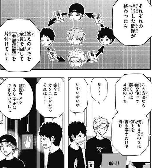 それは残っている『共通課題』を得意分野で4等分し、四人で手分けして解いてそれぞれ解答をメモし、その解答のメモを全員で回して『共通課題』を片付けるというものです。しかし、皆から完全にカンニングだろう、監視カメラもあるし不正はできないっしょ、と言われてしまいます。