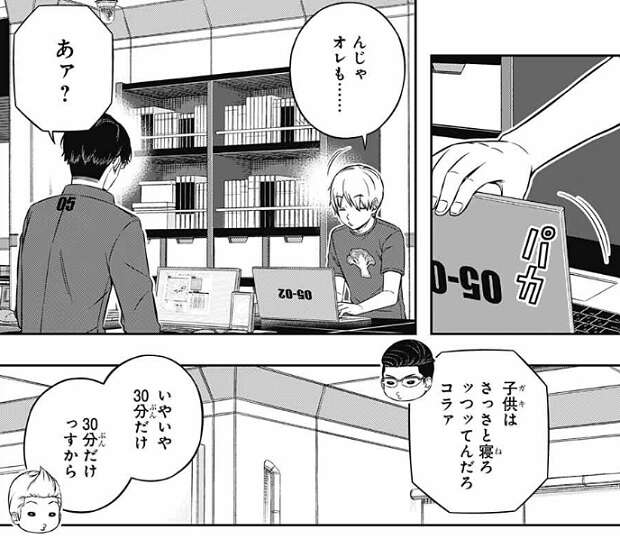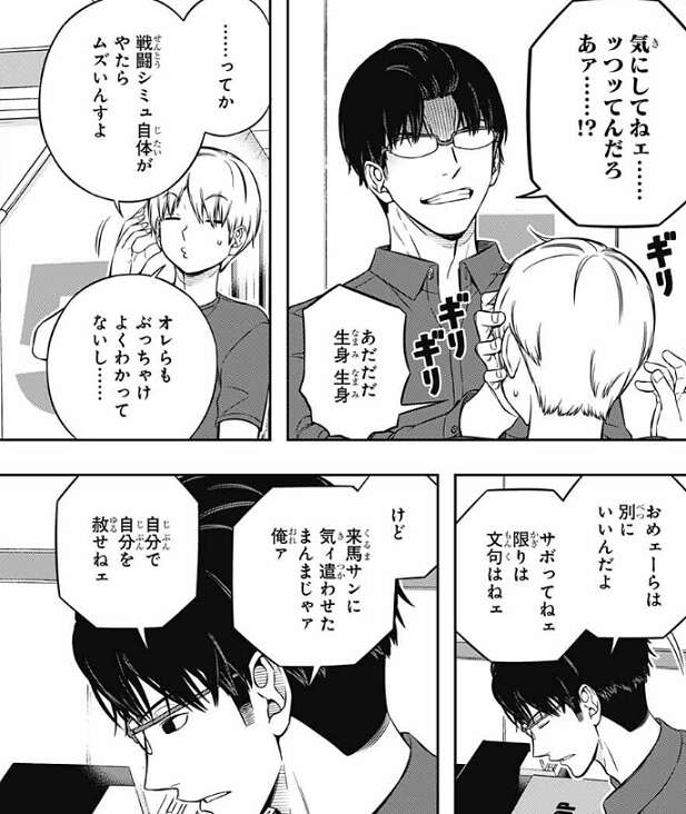 来馬5番隊の弓場は夜遅くまでノートパソコンを見ていて、悩んでいる様子の弓場に小荒井が声をかけます。弓場は戦闘シミュの成績を気にしていて、どうやら苦手な戦闘シミュの復習をしているようです。小荒井は特別課題で稼いだから気にすることない、と言いますが、けど来馬サンに気ィを遣わせたまんまじゃァ俺ァ、自分で自分が赦せねェ、と弓場は言い出来ないことを放っぽったまんま、気持ちよく寝るわけにはいかない、と意地でも戦闘シミュの復習を続けます。