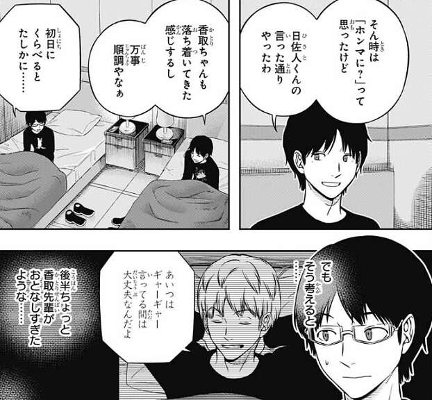 それを聞いた小荒井は自分も30分だけ、と弓場と一緒に戦闘シミュの復習を始めます。一方、諏訪7番隊では三雲と隠岐がベッドに入って、眠りにつこうとしていました。二日目は順位が良くなったので、気分がいいと隠岐は三雲に話します。