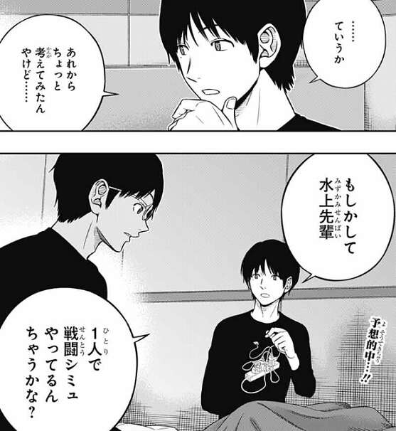 そして、諏訪7番隊の隠岐が水上のやり方に気付きました。隠岐だけでなく諏訪も思い当たる節があるようですが、3日目以降の戦闘シミュのやり方を諏訪7番隊がどうするのか、注目です。