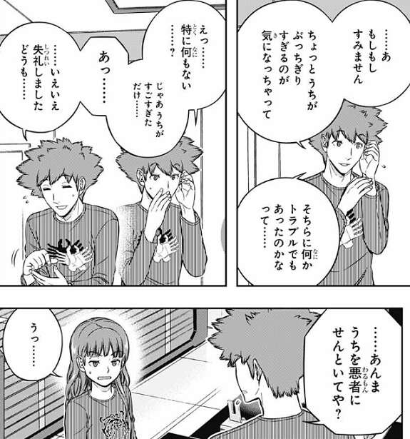 電話で訊かれると戦闘シミュの事を隠している事がバレる水上は、こっちからかけると嫌味に聞こえて悪者になってしまうと照屋に言い、電話をかけることを止めさせます。さらに、負けて納得しないならともかく、勝ってて納得しないってすごいな、と照屋に言い、遠回しにこれ以上気にしないように照屋を牽制します。