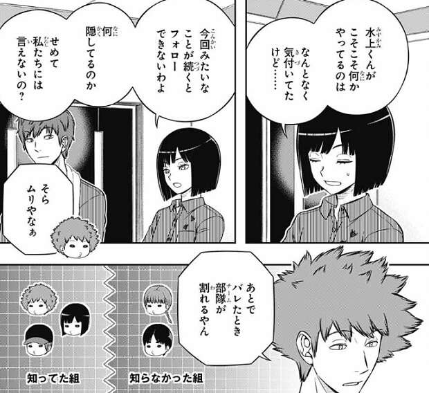 部屋の外に水上を連れ出した今は水上を説教していると、荒船がシャワーを終えて戻ってきます。水上がこそこそ何かやっているのは、なんとなく気付いていた、と今は言い、今回のようなことが続くとフォロー出来ないから、何を隠しているかせめて私達に言えないの?と、今は水上に聞きます。しかし、あとでバレたときチームが割れる、と水上は隠している事を言うのを拒否し、こういう場合はうそつきは一人でいい、とハッキリ言います。今は荒船の意見を聞きますが、荒船は隊長である水上の好きにさせればいいと言い、信頼関係が壊れたら自分と今でリーダー役を引き継げばいい、と断言して水上にチーム乗っ取りだと怖がられます。