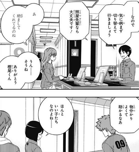しかし、樫尾が励ましてくれてることに気付いた照屋は、樫尾にありがとうと感謝して切り替えて作業を続けることにします。その会話を外で聞いていた水上達は、物分かり良くて助かるなあ、ほんといい子たち、と樫尾と照屋を褒めます。
