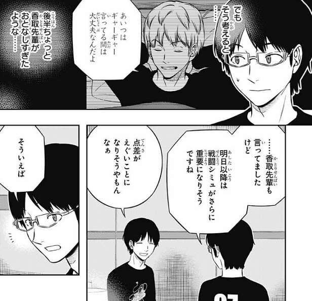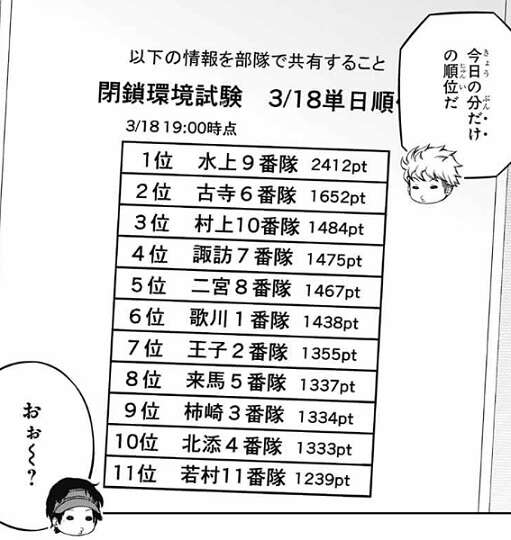 物語の中心となる諏訪7番隊では、水上が1人で戦闘シミュをしている事に隠岐が気付きました。3日目は戦闘シミュの得点が倍になるので、戦闘シミュの結果はさらに重要になります。諏訪7番隊はどのような戦術をとるでしょうか?水上と同じように1人で操作する戦術を採用するのか?今まで通り全員で操作するのか?今後の展開に注目です。