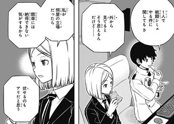 前回、223話で審査官として審査・採点していた片桐隊の尼倉亜澄ですが、尼倉はスポッター(観測手)というポジションです。今まで出てきたことのないポジションなので、少し触れてみたいと思います。以下のシーンは、223話で水上の戦闘シミュを一人でやるやり方について議論する片桐隊のオペレーター、結束夏凛と尼倉です。尼倉は水上のやり方に懐疑的のようです。