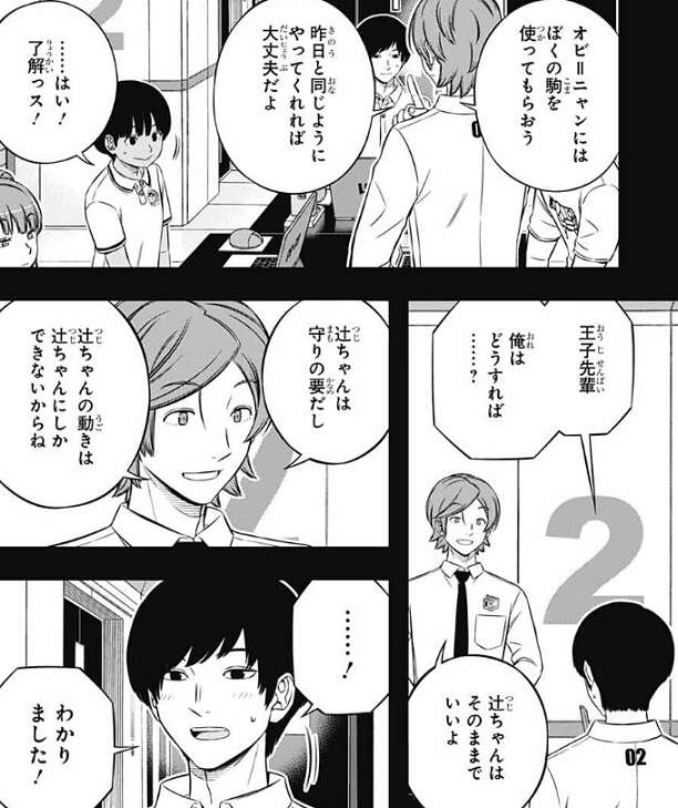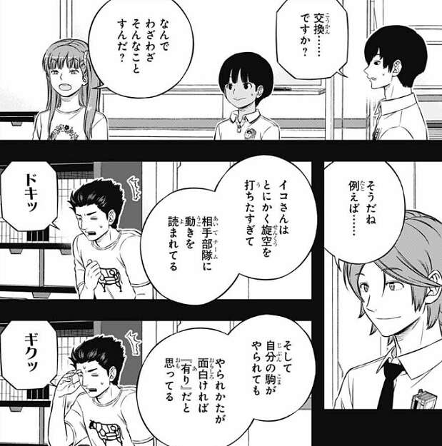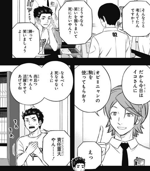 そして、生駒の駒は王子が使い、王子の駒は帯島が使うという指示を王子は出します。辻はチームの守りの要で、辻の動きは辻にしか出来ないという事で、辻は引き続き自分の駒を使う事になります。このような作戦で王子隊は戦争シミュ3日目だけ変化をつけていて、作戦としては北添隊に近いものになっています。迅から、自動的に裏をかく感じになっているのがおもしろい、と評価されています。