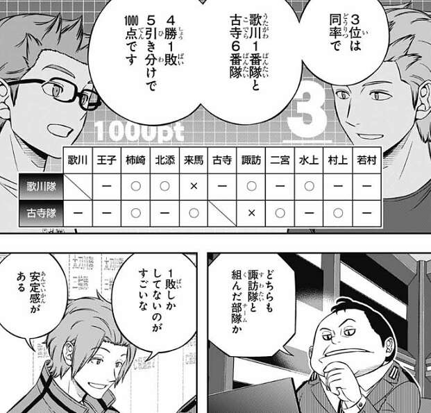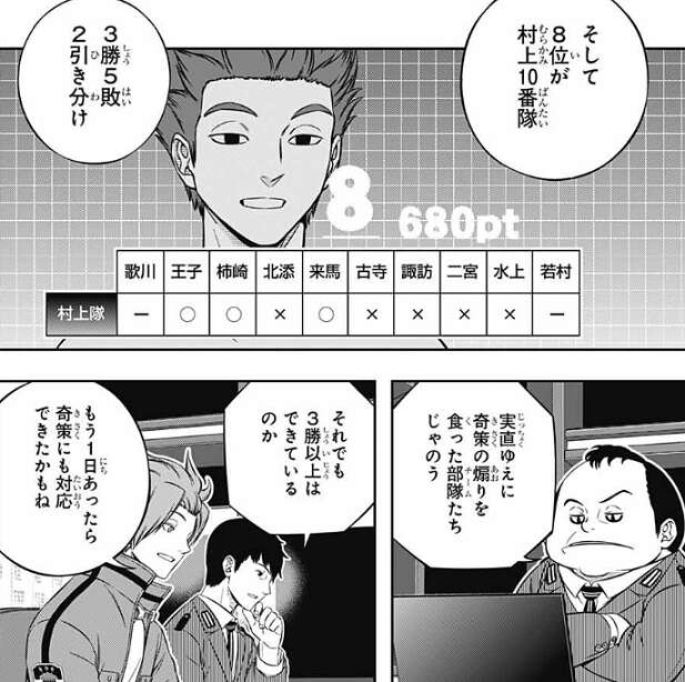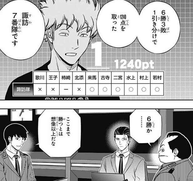 そして数十分後、全ての戦闘シミュ③が終わり、場面は運営本部デスクへと移ります。本日の結果を振り返っており、1位を取ったのは諏訪7番隊でした。諏訪7番隊は、6勝3敗1分け、1240点を取り11チーム中で唯一6勝しております。配点の多い3日目にしっかり照準を合わせた諏訪の指示を迅が評価し、三雲の分析とアイデアを城戸が評価しています。『映像問題』の問題文をカメラで撮り、皆のパソコンで何回も動画を見ながら解く、という229話の三雲のやり方も鬼怒田が評価しています。