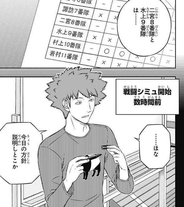 そして、城戸が注目していた二宮8番隊と水上9番隊の話になり、場面は戦闘シミュ開始数時間前の水上9番隊に戻ります。水上が隊員に今日の方針の説明を始めようとしています。