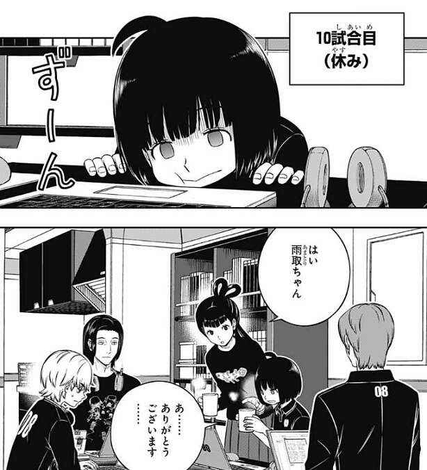そして、二宮隊の10試合目は休みですが、雨取はかなり落ち込んでいます。どのチームも雨取狙いの戦術で、二宮隊は9試合で1勝しかできていません。戦闘シミュはあと残り1試合のみで、絵馬も東も相手チームがなぜ、雨取ばかり狙ってくるのか分かっていないようです。