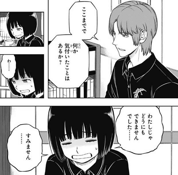 雨取が加賀美に入れてもらった飲み物を飲んでいると、二宮が、ここまでで何か気づいた事はあるか?と、声を掛けます。雨取は、私じゃどうにもできませんでした……、と謝り、二宮の質問に答えることが出来ません。加賀美は雨取のせいじゃない、と雨取をフォローし、絵馬もその言葉に頷きます。