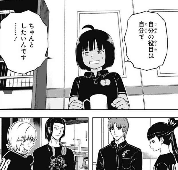 すると二宮は勘違いするなと言い、最初に細かい指示は出さない、自分で考えて動けと、言っているので、隊員がこの方針に従っている限り責任は命令を下したおれにある、と二宮は雨取に責任はない、とハッキリ言います。しかし、雨取は玉狛第2で三雲と一緒に闘っていた時を思い出しながら、自分の役目は自分で、ちゃんとしたいです……!と、はっきりと二宮に自分も責任をもってやりたいと言います。