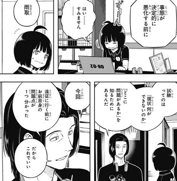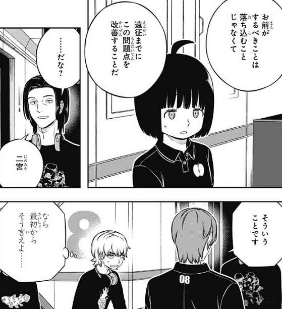 二宮は、……それが今できなかった、って話じゃないのか?と、言います。そして、自力で解決しようとするのはいい心がけだが、自分の手に余ると感じたなら早めに誰かの手を借りるべきだ、と二宮は注意します。二宮の正論にさらに落ち込む雨取ですが、東から、試験は現状何が出来ないかや、どこに問題があるか、を知る為で、遠征に行く前にこの戦闘シミュで問題点が1つ分かってから、これでいい、とアドバイスされます。