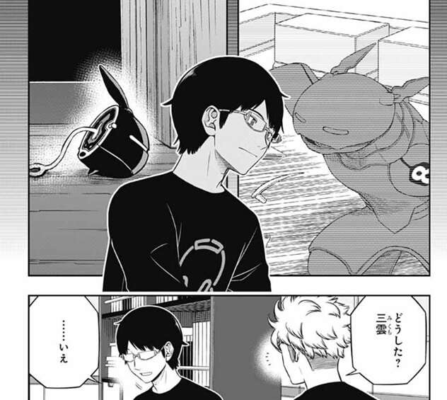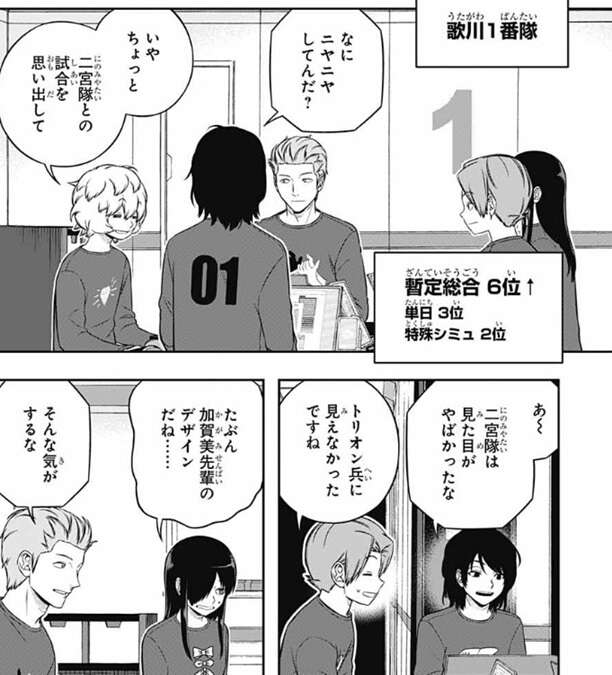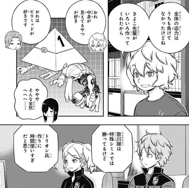 全体の迫力では歌川隊も負けてなかったと空閑は言い、志岐がいろいろなトリオン兵を作ってくれたからと理由を言います。空閑は中身が見えているトリオン兵が好きだと言い、巴はピラミッドが好きだと言うと、志岐は照れながらも嬉しそうな反応を見せます。その様子をモニタールームで見ていたA級加古隊の黒江は、歌川隊は特殊シミュでは勝っているけど、トリオン兵作りに時間使いすぎだと思うと意見を言います。分担課題の進みが全チームで最下位のようで、志岐には課題をやってもらうべきだったんじゃない?と、黒江は言いますが、A級草壁隊の緑川は志岐がみんなと喋れるようになっていると反論します。