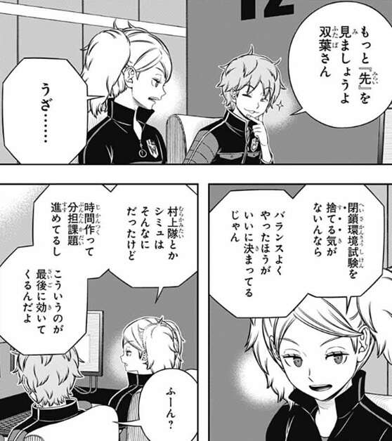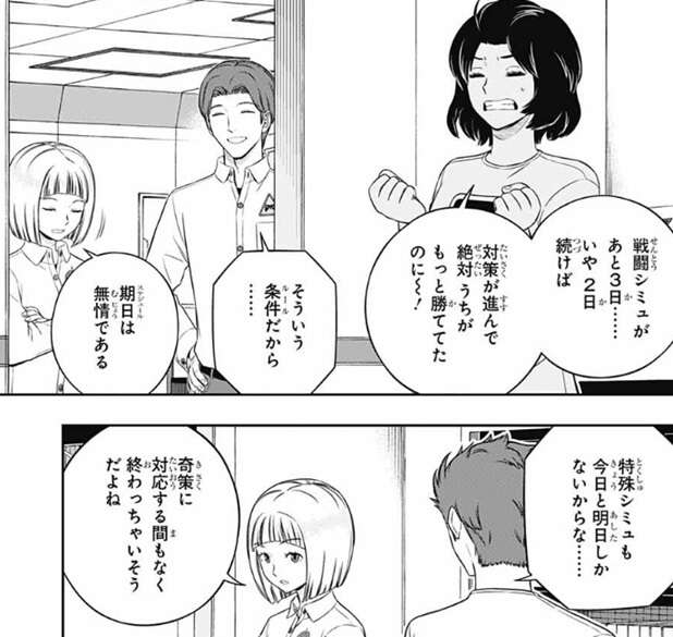 村上も会話に入ってきて、おれのサイドエフェクトはそこまで万能じゃないと言い、学習能力と今回のような発想力勝負は別の話だと村上は言います。このチームは奇策で一発勝負より、積み重ねで強さを発揮すると村上は冷静に分析しますが、熊谷はあと2日戦闘シミュが続けば積み重ねの強さを持つチームなので、対策が進んで絶対うちがもっと勝ててたのに~!と、悔しがります。氷見と蔵内はそういうルールだから、と諦めていますが、堤は明日を『4日目』くらいのつもりでやるのはどうだ?と、提案します。