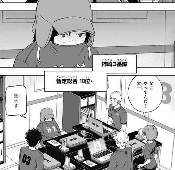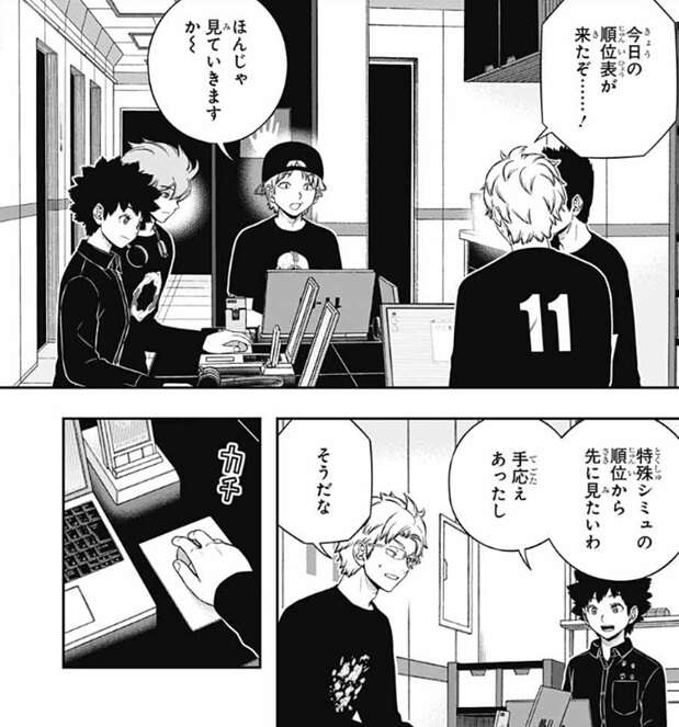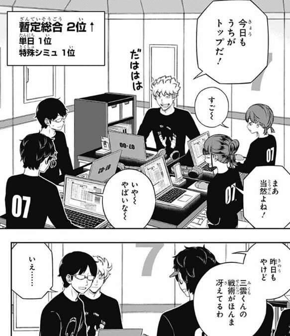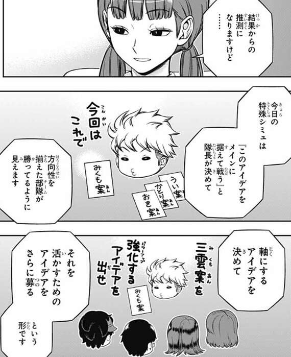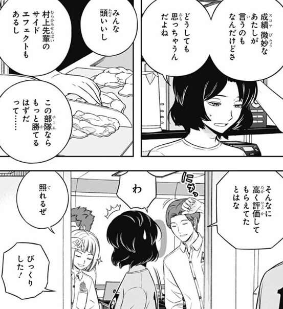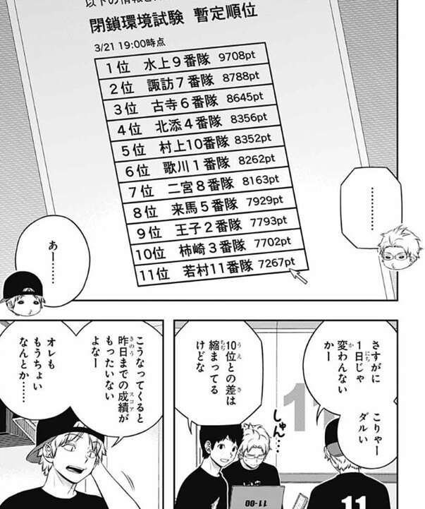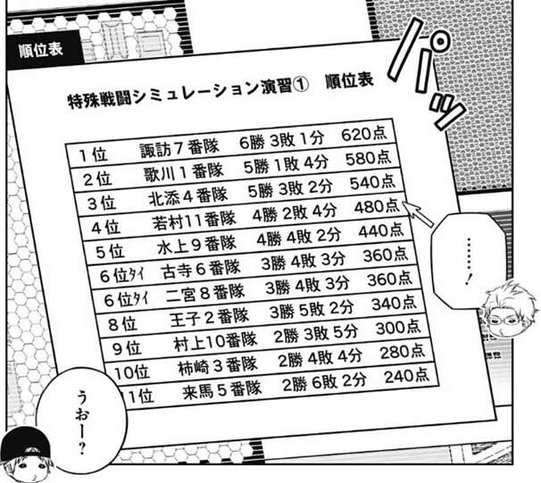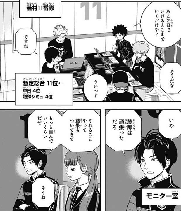 結果、若村隊は特殊シミュの順位は4位と判明します。上には諏訪7番隊、歌川1番隊、北添4番隊がいます。戦闘シミュ1日目、2日目で圧倒的だった水上9番隊や二宮8番隊より上なので、若村隊は全員喜んでいます。若村自身も、作戦次第でこのチームでも勝てると自信を持ちます。