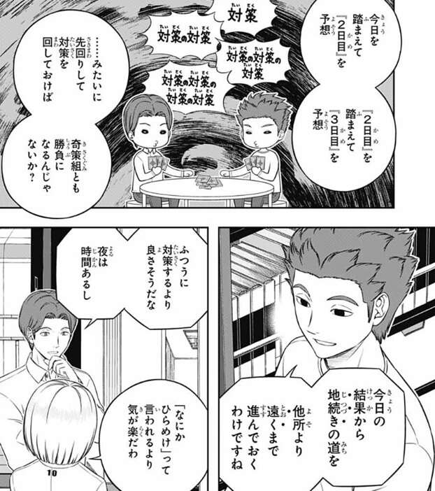 明日はどこも今日の試合を踏まえてくるので、今日を踏まえて『2日目』を予想、『2日目』を踏まえて『3日目』を予想、『3日目』を踏まえて『4日目』を予想、のように先回りして対策をしようと堤は言います。かなり労力が必要となりそうですが、村上も蔵内も氷見も乗り気で、今日やられた戦術やトリオン兵関係などを書き出して徹底的に対策を行う事になります。熊谷も夕食を急いで作るからと言い、村上はゆっくりでいいと答えます。この様子をモニタールームで見ていた草壁と佐伯は、未来の対策総当たりのようなやり方に驚きます。