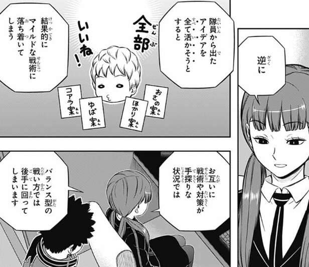 逆に隊員から出たアイデアを全て活かそうとすると、結果的にマイルドな戦術に落ち着いて、戦い方が後手に回ってしまうと草壁は言います。隊員の意見を採用しすぎては駄目ということか、と風間が言うと、隊員を育てるのが目的なら上手くいっても失敗しても経験になるのでいいが、目の前の勝負に勝つことなら隊長の責任で戦術をコントロールすべき、と草壁は主張します。