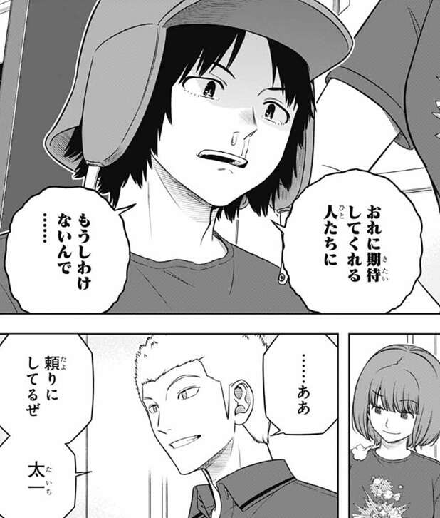 別役は涙をため鼻水を出しながら、おれに期待してくれる人たちにもうしわけないんで…、とつぶやきつ、やる気を取り戻します。柿崎も、頼りにしてるぜ太一、と別役を励まします。