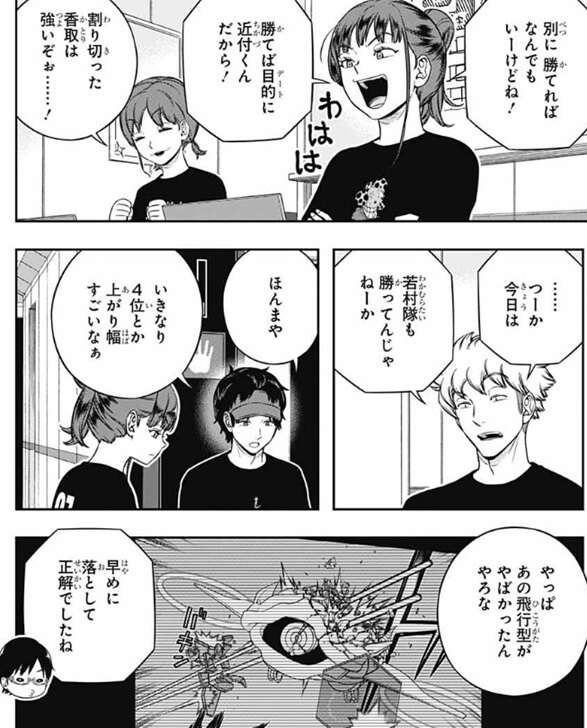 香取発案のトリオン兵はボツられたようですが、香取は勝てれば何でもいい、と笑っています。香取にとっては烏丸との目的(デート)に近付ければいいようで、割り切った香取は強いぞぉ……!と、宇井がつぶやいています。また、諏訪が若村隊の成績にも触れていて、若村隊も勝って一気に順位を4位に上げている事を話題にしています。若村隊の飛行型がやばかったというのは諏訪隊でも気付いていたようで、三雲は早めに落として正解だったと言っています。