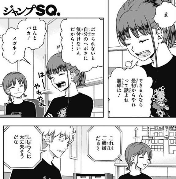 若村も最初から今日みたいにやれていたらと後悔しますが、過ぎたこと言ってもしゃーないわ、と細井は全員を励まし、あと二日で行けるとこまで行くだけと若村隊に気合を入れます。一方、モニタールームで見ているA級草壁隊の草壁と佐伯は若村を評価し、若村はもっと喜んでいいと言っています。その後話題は諏訪隊の戦術に移りますが、ヒュースの予想で大体あっていたそうで、他には『追跡移動』を味方に使って操作を楽にするなどの細かい工夫もあったようです。しかし、基本的にはヒュースの予想通り三雲のアイデアで、ランク戦で二宮に勝ったのはまぐれじゃなかったわけだ、と佐伯は三雲のアイデアに感心します。