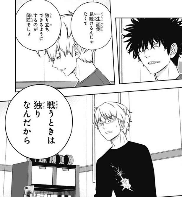 一生面倒見続けるんじゃなくて、独り立ちできるようにするのが師匠でしょ、戦うときは独りなんだから、と犬飼は影浦に自分の考えを伝えます。一方、ヒュースは犬飼から聞いた狙いや考えを若村に伝えます。