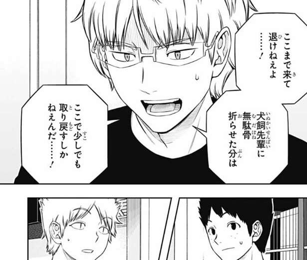 トリガーを使った戦闘で一番大きな要素はトリオン量の大小で、一方でさっき若村が言ったのはチーム成績の優劣の話だ、と言い、単純にチームとして玉狛第2の方が香取隊より上だったと言う結論では不満なのか、とヒュースは聞きますが、若村は、三雲の代わりに玉狛第2に入ってもB級2位になれたか自信がない、と言います。さらに、もし三雲が香取隊にいたらもっといい順位を獲っていた気もする、と若村が言うと、ヒュースは、おそらくその通りだろうな、と言います。半崎と笹森はヒュースと若村の会話を間近で聞いていますが、ヒュースが言いにくい事をずばりと言うので傍でひやひやしています。