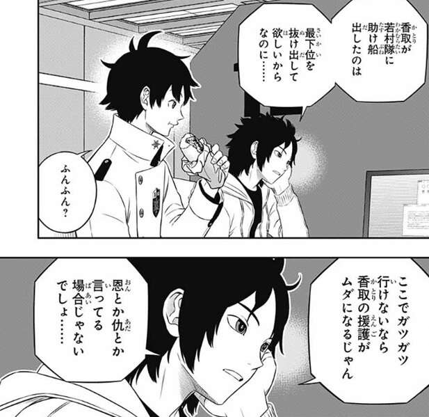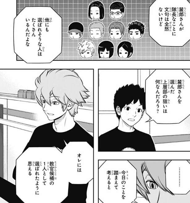 戦力の底上げのための『教官』としては、香取のような直感タイプは難しいとヒュースは言い、三雲も少々特殊過ぎると言います。そして、現時点では若村はおそらく臨時隊長の中では未熟な部類だろうが、この先自分の力で壁を越える経験を積んでいけるとしたら、とヒュースは仮定の話をします。