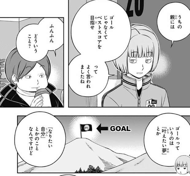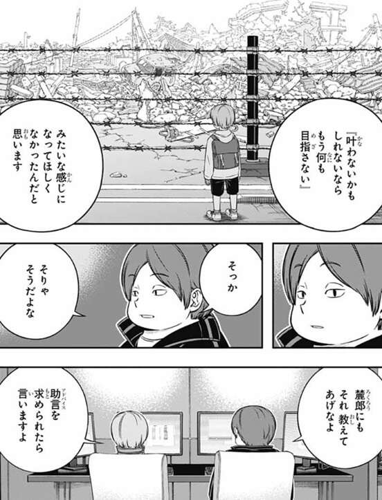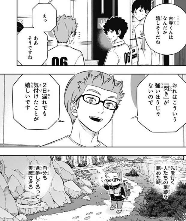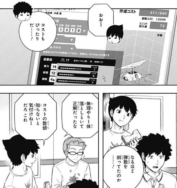 しかし、木虎は問題なのはこのトリックを解いたチームが今日、諏訪7番隊と同じような事が出来るということです、と言います。射程攻撃全般に対策は必須だと小寺は言い、弾対策専門のユニットを追加する感じか?と、奥寺が答えます。その場合、そのユニットは誰が操作するかという会話を奥寺と三浦がしていると、小寺は一昨日の諏訪隊との戦闘シミュを思い出し何かに気付きます。