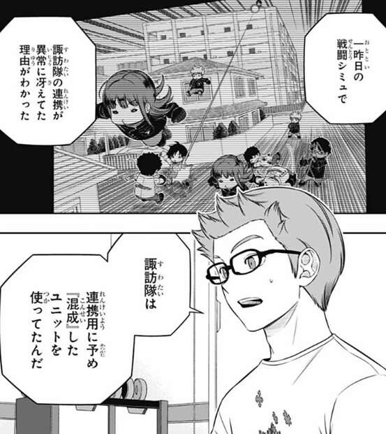 小寺は一昨日の諏訪隊との戦闘シミュで、諏訪隊の連携が異常に冴えていた理由が、連携用に予め『混成』したユニットを使っていた事に気付きます。小寺隊は自分の駒を自分で使っていましたが、諏訪隊がユニットを混ぜた3つの分隊を作っていたと全員が気付き、水上隊の連携のすごさも似たような理屈だったのではと推測します。