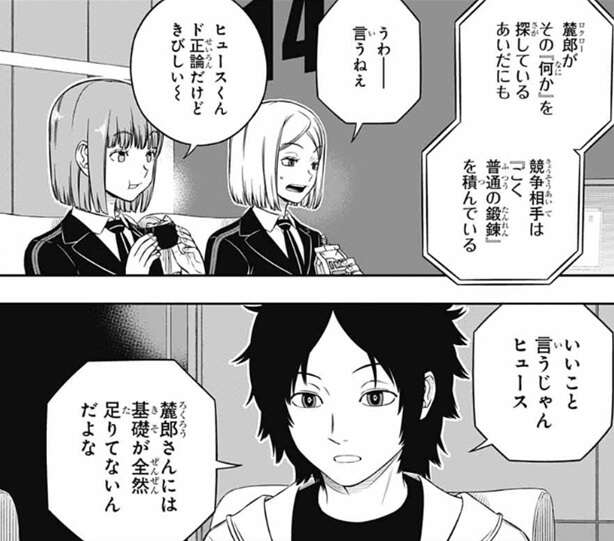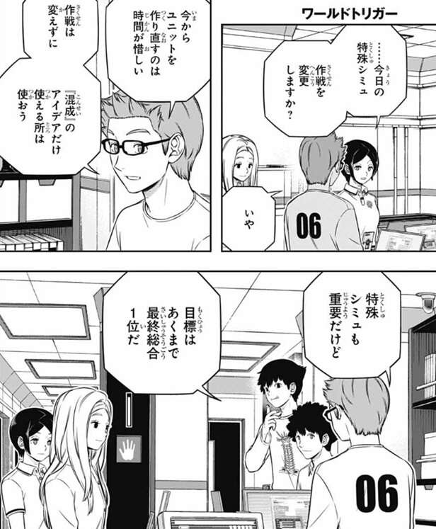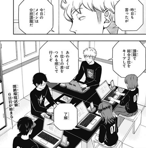 さらにヒュースには共通課題がまだ残っているようですが、大した量じゃない、とヒュースは余裕な様子です。それを見た若村はトリガー関連の分担課題を細井とヒュースに任せて、トリガー以外の一般課題をオレたちでやるぞと言い、13時までは課題優先で、その後特殊シミュの作戦会議を行うとチームメイトに指示します。