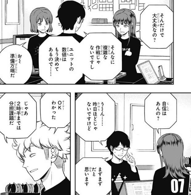 一方、諏訪7番隊も6日目の仕事を開始しますが、諏訪からシミュの予習時間を聞かれて三雲は30分と答えます。たった30分で大丈夫なのかと香取は言いますが、複雑な作戦でないのと三雲は既にユニットの数値を決めているようで、準備万端のようです。自信あんの?と香取に聞かれて、まずまずだと思います、と三雲が答えると、諏訪は2時半までは分担課題を全員で取り組むように指示します。
