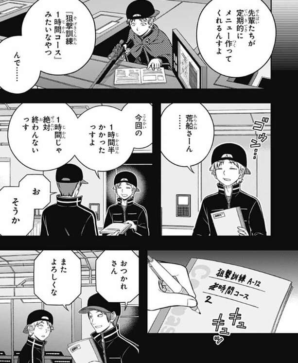若村は荒船隊ではどんな感じで教わっているのか半崎に聞くと、半崎は先輩達が定期的に訓練メニューを作ってくれると荒船隊の様子を明かします。『狙撃訓練1時間コース』を作ってくれた時の様子ですが、半崎が実際に試すと1時間半かかりそれを荒船に伝えると、その場でノートを2時間コースに変更します。