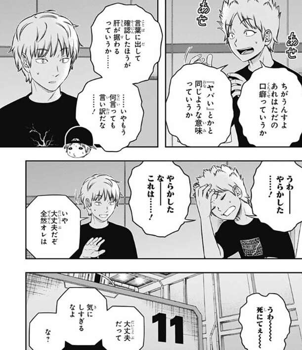 若村の言葉を聞いた半崎は、あんま思いつめないでくださいよ、臨時隊長だってちゃんとやってんだから、と若村を気遣いますが、若村は半崎が自分のリーダーぶりに不満があると思っていたと答えます。別に不満なんてないと答える半崎ですが、半崎の口癖のダルいを若村が気にしていると勘違いします。半崎は焦り始めて弁明を始めますが、何言っても言い訳だなと言い、やらかしたと動揺します。若村は気にし過ぎないように半崎に言いますが、花崎は死にたいと言い、動揺は続きます。一方、まだ部屋に残っているヒュースは笹森に、明日になっても若村が落ち込んだままなら、日佐人と真織が頼りだ、と笹森に若村のフォローを頼みます。
