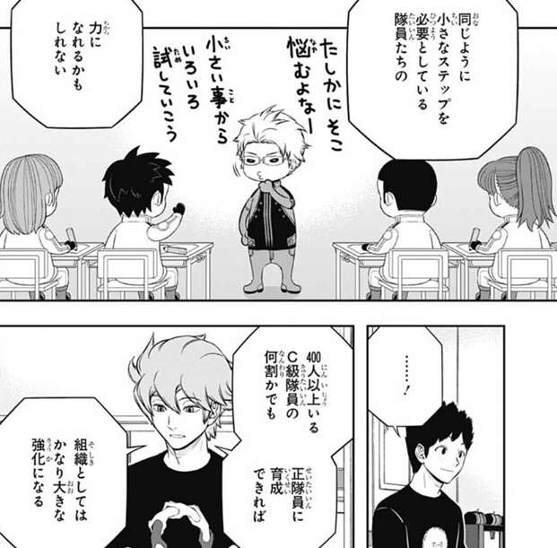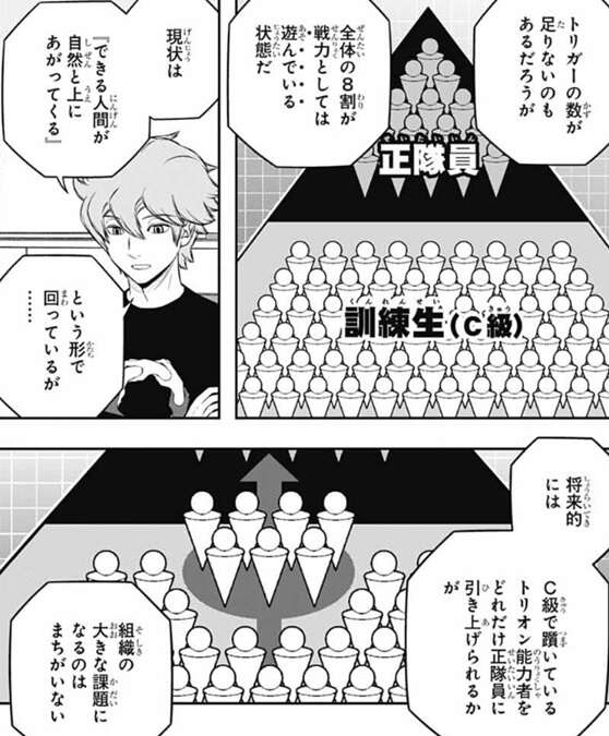 前提として現在のボーダーは正隊員に対して訓練生の数が多すぎるとヒュースは言い、トリガーの数が足りてないとしても、全体の8割がC級の訓練生で戦力としては遊んでいる状態とボーダーの現状を指摘します。そして、将来的にC級で躓いているトリオン能力者をどれだけ正隊員に引き上げられるかが、組織の大きな課題になるのは間違いない、とヒュースは言います。